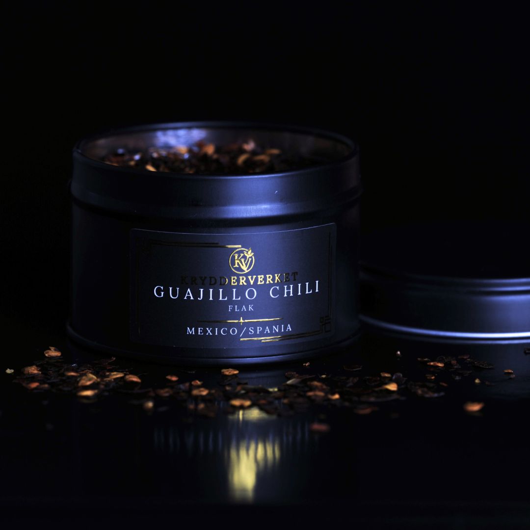 Fyldig, aromatisk og behagelig varm. Guajillo-chili er en av Mexicos mest brukte chilier, kjent for sin dype røde farge og komplekse smak med toner av tørket frukt, mild røyk og et hint av grønn te. I flakform gir den presis varme uten å dominere retten.